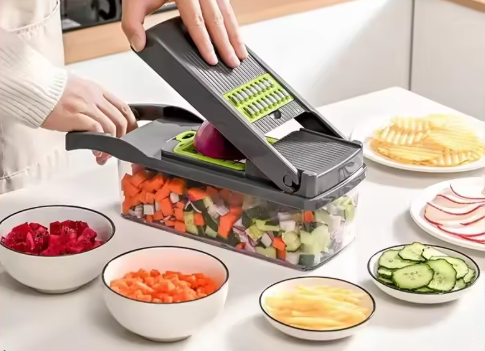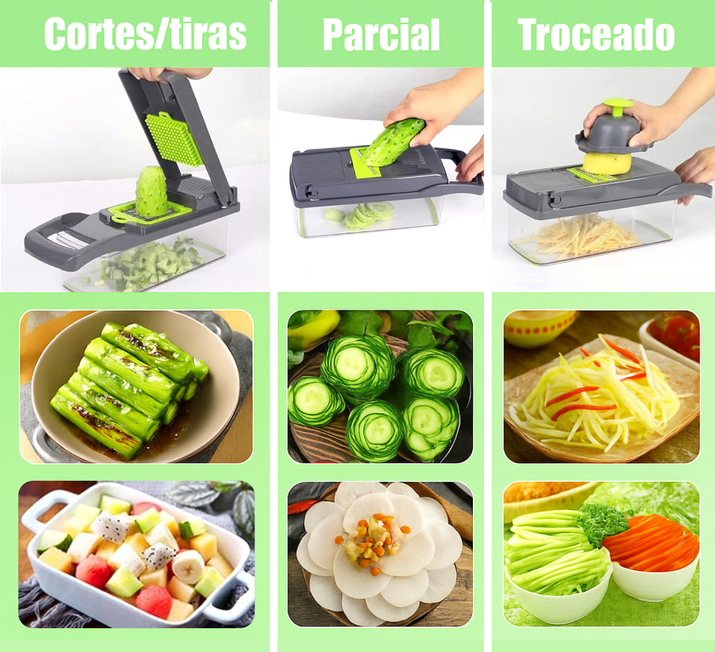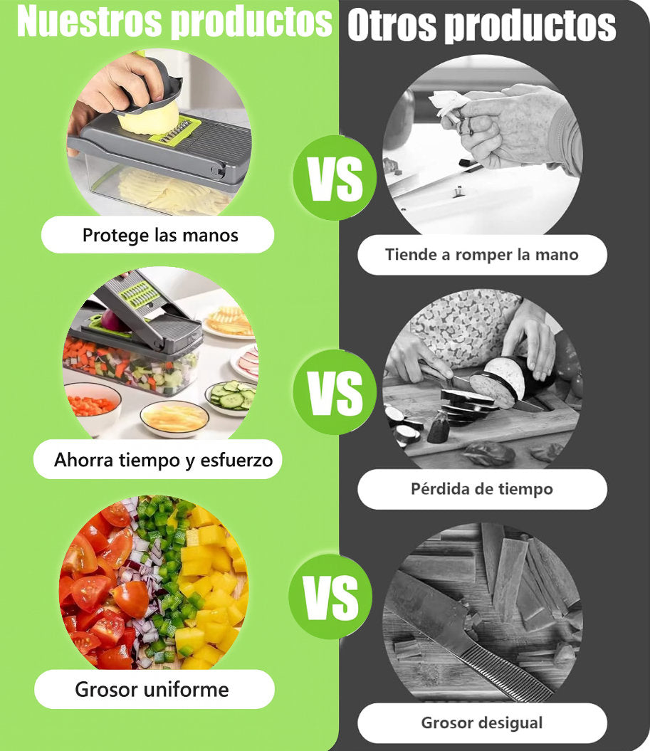 Este innovador utensilio combina funciones de rallar, picar, cortar y gratinar, permitiéndote crear platillos frescos y deliciosos con facilidad. Desde ensaladas ligeras hasta salteados gourmet, todo se prepara en segundos y con precisión de Chef.